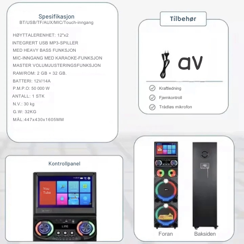 • Tilkobling: Bluetooth 5.0, Wi-Fi, USB, TF, AUX-IN, MIC-IN